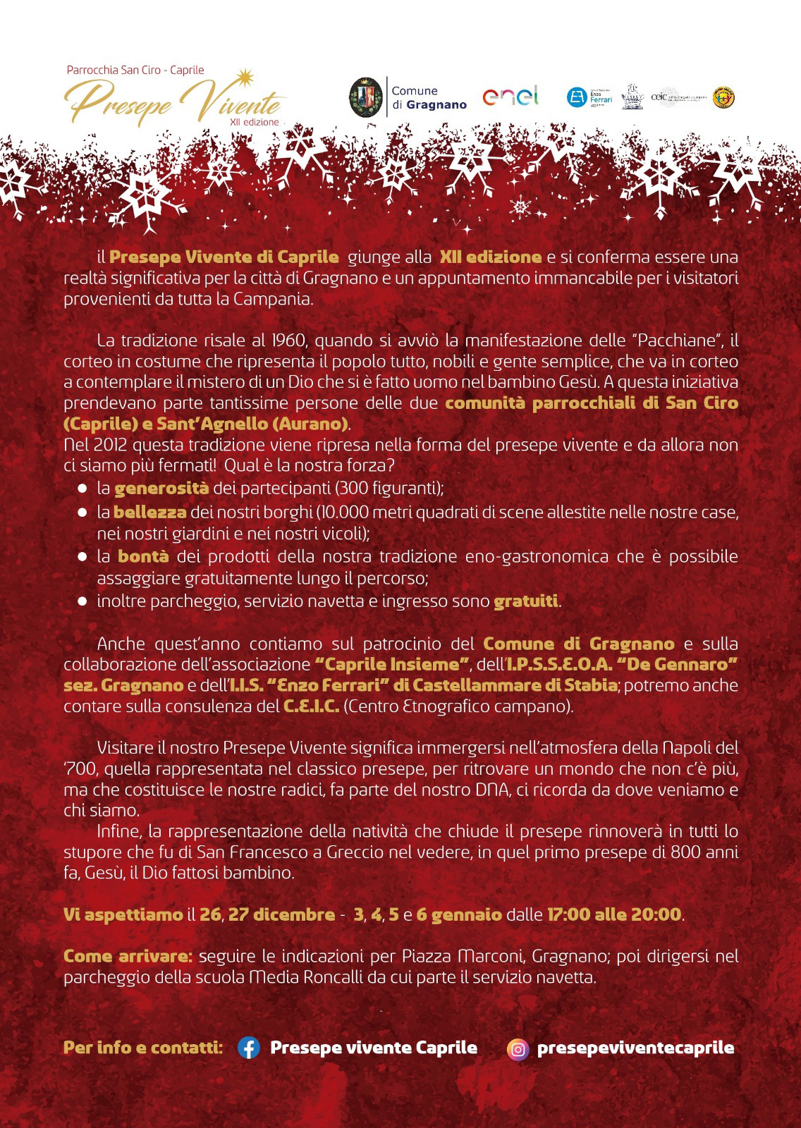 Anche quest’anno contiamo sul patrocinio del Comune di Gragnano e sulla collaborazione dell’associazione “Caprile Insieme”, dell’I.P.S.S.E.O.A. “De Gennaro” sez. Gragnano e dell’I.I.S. “Enzo Ferrari” di Castellammare di Stabia; potremo anche contare sulla consulenza del C.E.I.C. (Centro Etnografico campano).